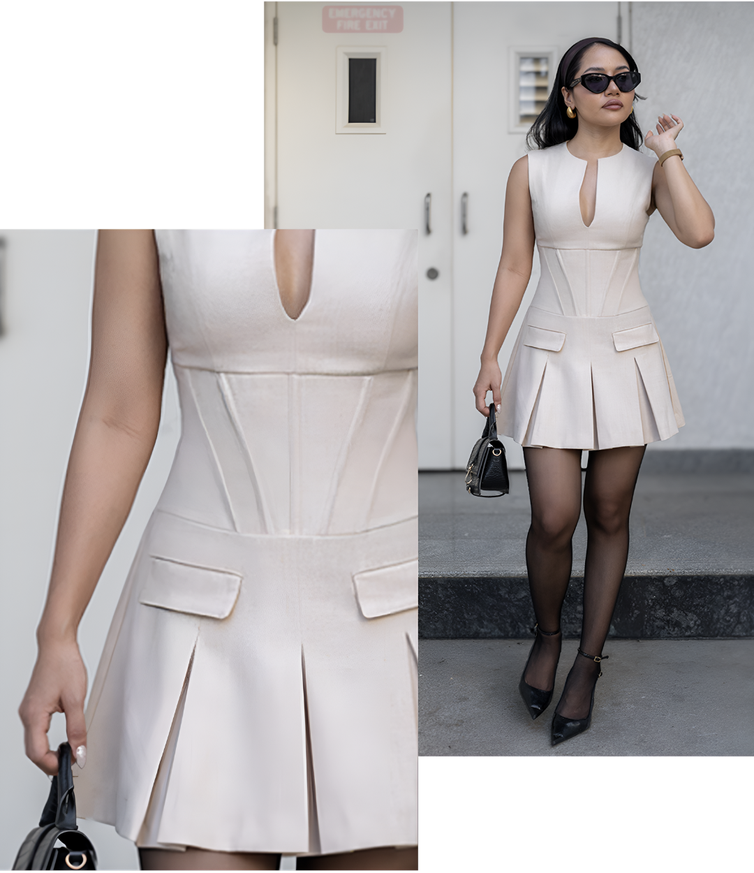 Zoe Beige brings understated elegance to power dressing with its finely sculpted corset, functional pockets, and a pleated skirt, proving that classic colors can indeed carry bold statements.